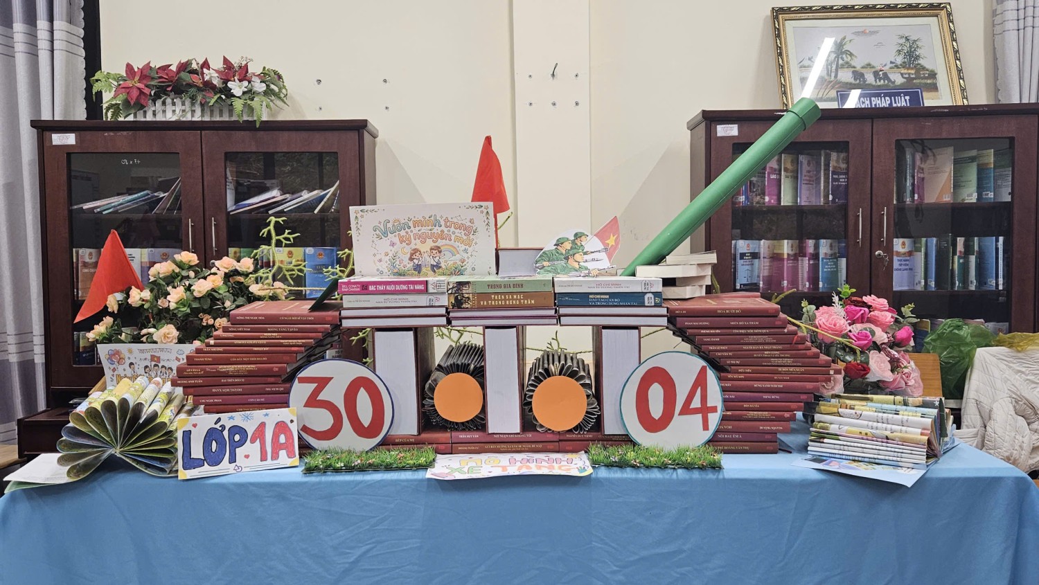 xếp sách nghệ thuật dành cho học sinh Tiểu học. Bằng sự sáng tạo và khéo léo, các em đã cùng nhau tạo nên những mô hình độc đáo từ những cuốn sách quen thuộc như: hình ngôi trường, bông hoa, biểu tượng tri thức… Mỗi sản phẩm không chỉ đẹp mắt mà còn mang thông điệp ý nghĩa về vai trò của sách trong học tập và cuộc sống, thể hiện tinh thần đoàn kết và khả năng làm việc nhóm của các em học sinh.